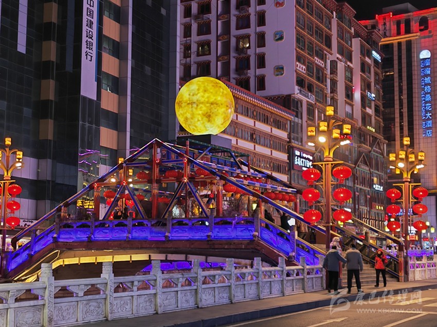 除了讓人眼前一亮的各種絢麗的花卉燈飾和被大紅燈籠、如意掛飾的大街小巷,最被市民津津樂道的莫過于中橋的明月景觀和東關(guān)U形廣場上的“五彩色神?!?。明月景觀又稱《世界的康定》,此景觀以月球為主體,在橋兩側(cè)再輔助以音符及五線譜造型。其寓意為情歌唱響世界,康定名揚世界。而矗立在東關(guān)廣場上的新增雕塑景觀就更意義非凡了。雕塑通體是以一頭雄壯的牦牛形象呈現(xiàn),牦牛下方的紅色高臺正前方鐫刻的是政府公仆一心為民的錚錚誓言。“政府精心營造喜慶洋洋的節(jié)日氛圍,讓我們感受到了濃濃的‘年味’,在黨和政府的關(guān)懷下,我們老百姓的生活一年更比一年好,幸福感也是一年更比一年強?!?5歲高齡的扎西激動地跟記者分享著他的喜悅。