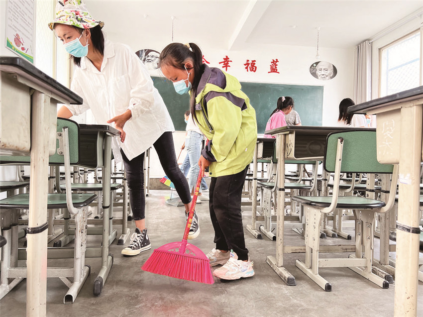 在學(xué)校一樓走廊,記者看到墻壁上貼滿了孩子們自制的民族團(tuán)結(jié)手抄報(bào)和五十六個(gè)民族一家親的畫作。瀘定橋小學(xué)副校長(zhǎng)杜德琴告訴記者,這是學(xué)校開(kāi)展鑄牢中華民族共同體意識(shí)主題教育實(shí)踐活動(dòng)的內(nèi)容之一?!斑@些都是老師、家長(zhǎng)和學(xué)生一起完成的,‘團(tuán)結(jié)’與‘奮進(jìn)’已深深印刻在瀘定橋小學(xué)每一個(gè)人的言行中,我們是愛(ài)的傳遞者,我們是在以實(shí)際行動(dòng)踐行校訓(xùn)。我希望災(zāi)區(qū)的孩子們能盡快走進(jìn)學(xué)校,繼續(xù)學(xué)業(yè)。”