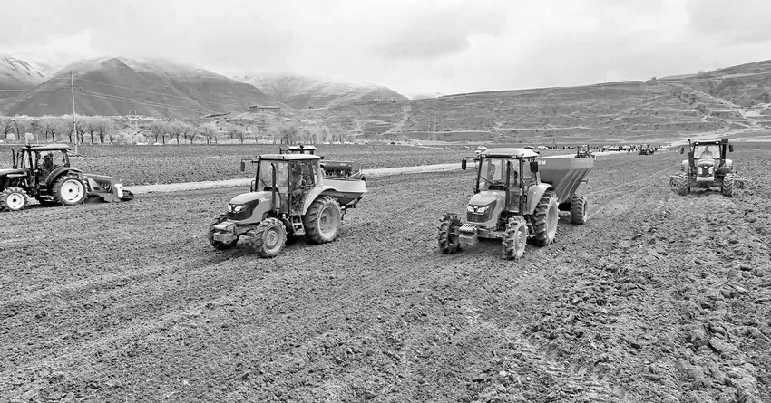 在甘孜縣圣康田園綜合體3900余畝的青稞地里,機(jī)器轟鳴、人流涌動,拖拉機(jī)、液壓翻轉(zhuǎn)犁、撒肥機(jī)、聯(lián)合重耙、播種機(jī)等先進(jìn)農(nóng)業(yè)科技裝備紛紛亮相,翻耕、播種和施肥等一氣呵成。