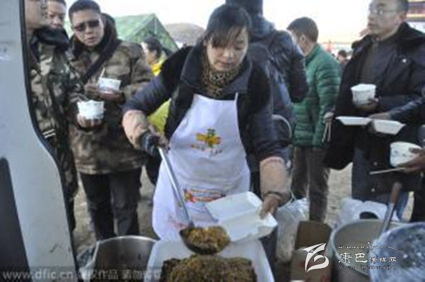 據(jù)了解,韓大哥是這家飯店的老板之一,他是仁壽縣人,幾年前和朋友來到新都橋開始經(jīng)營(yíng)飯店??刀?.3級(jí)地震發(fā)生時(shí),他人在成都。但看到災(zāi)情發(fā)生,韓大哥立即和飯店另外幾個(gè)合伙人決定到安置點(diǎn)免費(fèi)送盒飯,“我在當(dāng)?shù)刈隽?、7年生意,現(xiàn)在出了事情,就應(yīng)該伸手支援嘛!”據(jù)韓大哥介紹,此次地震發(fā)生后,新都橋80%左右的飯店都已經(jīng)關(guān)門,他們的飯店因?yàn)檫€有一些接待工作,仍在正常營(yíng)業(yè)。自11月23日晚上,他家的飯店就主動(dòng)為塔公鎮(zhèn)的安置點(diǎn)免費(fèi)派送盒飯,“包括中午和晚上兩頓,兩葷兩素一湯的配置。”因?yàn)樘?, 韓大哥來不及仔細(xì)統(tǒng)計(jì),他大概知道每天送出的盒飯?jiān)?200盒到1500盒之間,每天送出盒飯的成本在4、5千左右。但在他看來,這些其實(shí)都算不上什么,“能為災(zāi)區(qū)出一份力,我們就很滿足了,我們打算一直送到抗震救災(zāi)工作結(jié)束,也就是直到災(zāi)民有條件自己做飯的時(shí)候。”“這邊天氣很冷,他們吃的一般是些面包、牛奶之類的干糧,我們就是想讓大家吃到熱飯、熱菜。”據(jù)韓大哥介紹,每天飯店都會(huì)派出3、4個(gè)人將盒飯運(yùn)送到安置點(diǎn),“只要有人需要我們都會(huì)分發(fā)盒飯,包括一些志愿者和武警官兵也吃我們的飯。