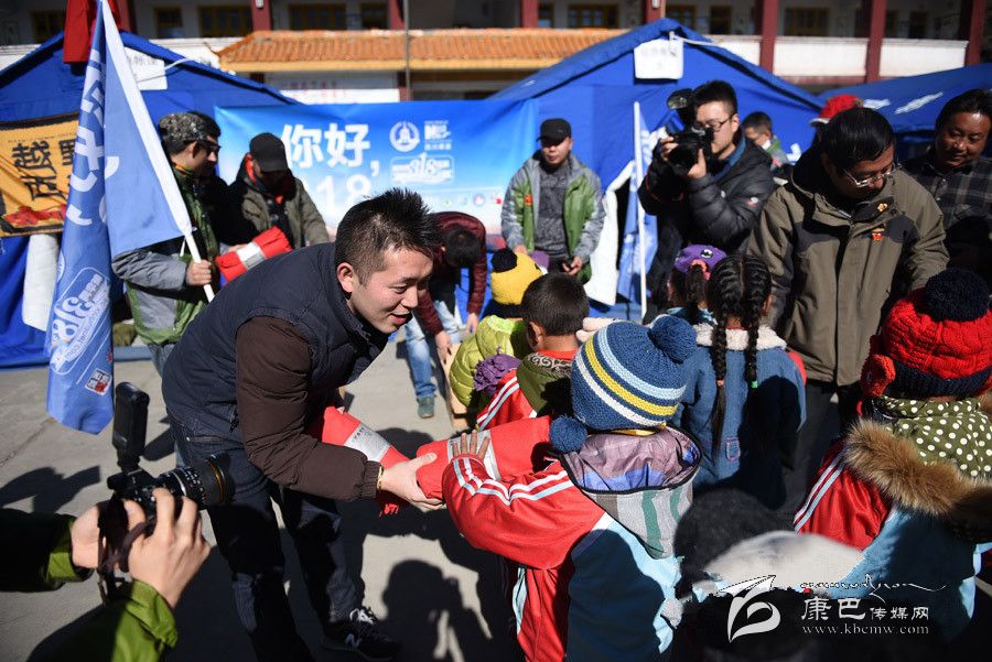 新華網(wǎng)“你好,318”全媒體行活動(dòng)領(lǐng)隊(duì)黨文伯為孩子送防寒毛毯(薛玉斌 攝)