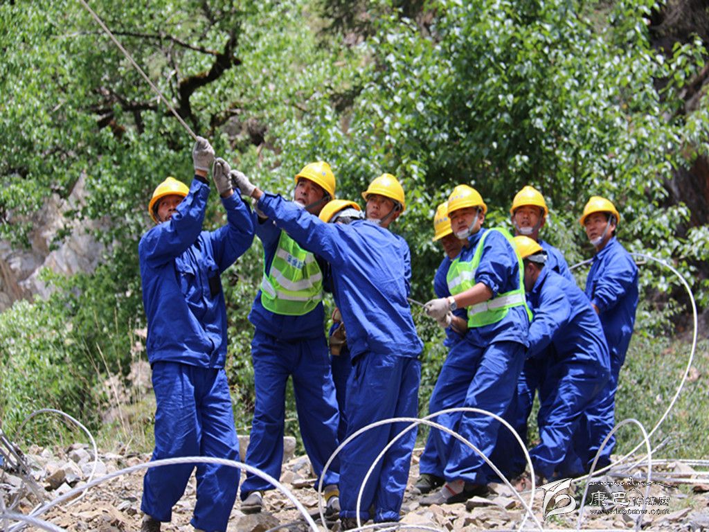 “辛苦”二字同樣印在工程管理者的工作中。手握對(duì)講機(jī)、身穿工裝的工程項(xiàng)目負(fù)責(zé)人龍森,此刻正頂著烈日在工地對(duì)一位工人叮囑施工事項(xiàng)。龍森是甘孜電力建設(shè)有限公司的工程技術(shù)人員,他對(duì)工程管理非常嚴(yán)格,如果工程進(jìn)度稍慢點(diǎn),他就會(huì)焦急萬分??擅棵靠匆姽と藗冺斨胰铡⒚爸L(fēng)雨加班加點(diǎn)趕工程進(jìn)度時(shí),龍森的心里也特別不是滋味。對(duì)這項(xiàng)工程的不易龍森深有體會(huì)。架桿初期,有些路段山坡土質(zhì)松軟,一遇到下雨就容易滑坡塌方,為了不影響工程進(jìn)度,龍森和工友們常常要一邊做“修路工”的工作一邊做“架桿工”的工作。龍森說:“最苦的是,這里有些路段車輛根本無法進(jìn)入,一根電桿重1.2噸,要靠十多名工人用繩索和木頭抬進(jìn)工地。德差鄉(xiāng)距離縣上有170多公里,單程就要4小時(shí),工程緊的時(shí)候一周要往返縣上兩三趟。還記得有一次車胎在海拔近5000米的呷布科山上爆了,山上手機(jī)沒有信號(hào),得不到救援,餓了我們就在山上吃點(diǎn)自帶的干糧,等了近半天才等到一位騎摩托車的老鄉(xiāng)路過,回到休息地的時(shí)候已經(jīng)是半夜兩點(diǎn)多了。”說到這里,龍森無奈地?fù)u了搖頭。世上無難事,只怕有心人。龍森說,這段路線的電桿已經(jīng)全部立起來了,現(xiàn)在只剩下架線的工作。一定要搶在月底之前為這兩個(gè)村通上電。