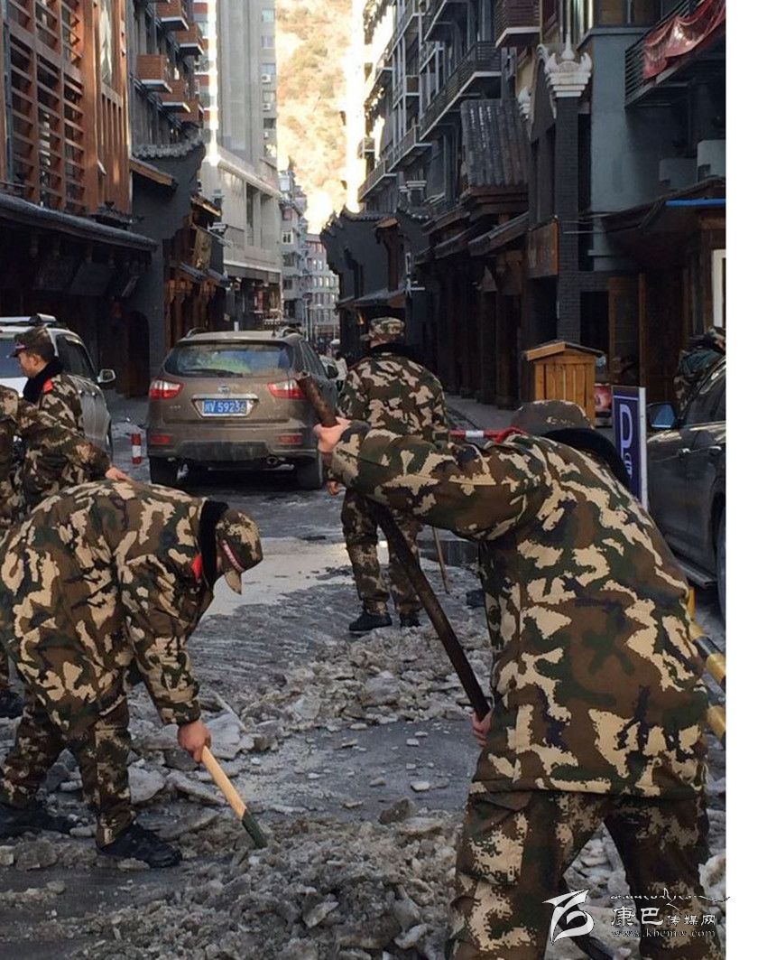 本網(wǎng)報(bào)(土登 文/圖)大雪過(guò)后,康定城的部分陰面路段結(jié)起了厚厚的冰,給過(guò)往行人及車輛帶來(lái)了極大的安全隱患。1月31日,武警甘孜支隊(duì)第三大隊(duì)組織官兵義務(wù)掃雪除冰,贏得了過(guò)往行人點(diǎn)贊。圖為官兵們?cè)谇鍜呖刀ㄊ兴咏值澜Y(jié)冰路面。