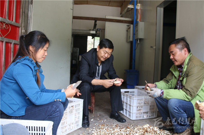柳孝林(中)和工人一道加工菌類。