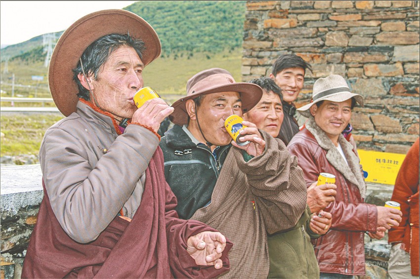村民在品嘗藍逸公司生產(chǎn)的牦牛壯壯。
