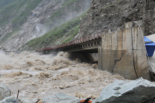 6月29日,恰逢周末,但在該公司的防汛指揮中心已是繁忙緊張氣氛,防汛值班員雖已熬紅了雙眼,緊盯著監(jiān)視屏并時刻保持與前方的聯(lián)系;7時23分,該公司副總經(jīng)理杜三林,長河壩工程部、安全環(huán)保部相關(guān)負(fù)責(zé)人來到了指揮中心;8時,流量逼近4170立方米每秒;10時,流量超過4200立方米每秒,已超過該工程自2010年開工以來最大流量,整個指揮中心的氣氛變得隨之凝重起來;10時30分至11時,指揮中心接連收到施工單位電話險情報告:此時此刻,長河壩工程初期導(dǎo)流洞水勢兇猛,導(dǎo)流洞出口橋0號橋臺回填料淘刷嚴(yán)重,1號橋墩發(fā)生傾斜,橋梁隨時有傾覆的可能,將會危及下游圍堰高程最低的中水十四局、中水五局營地的安全,更將會危及到300余名員工的人身安全;金湯河突發(fā)特大洪水,沖垮了通往金湯土料場的場內(nèi)公路,沿線山體已發(fā)生了小型泥石流,土料場通訊、交通已全部中斷,急需救援;持續(xù)降雨引發(fā)響水溝泥石流,3萬余立方米泥石流堆積物順溝而下,沖垮了響水溝石料場的鋼橋,并堵塞了場內(nèi)12號路1號隧道。必須馬上清運(yùn)疏通,否則,響水溝再發(fā)泥石流,長河壩上游圍堰和大壩填筑工作面將直接面臨泥石流堆積物的直接沖擊,險情萬分緊急!