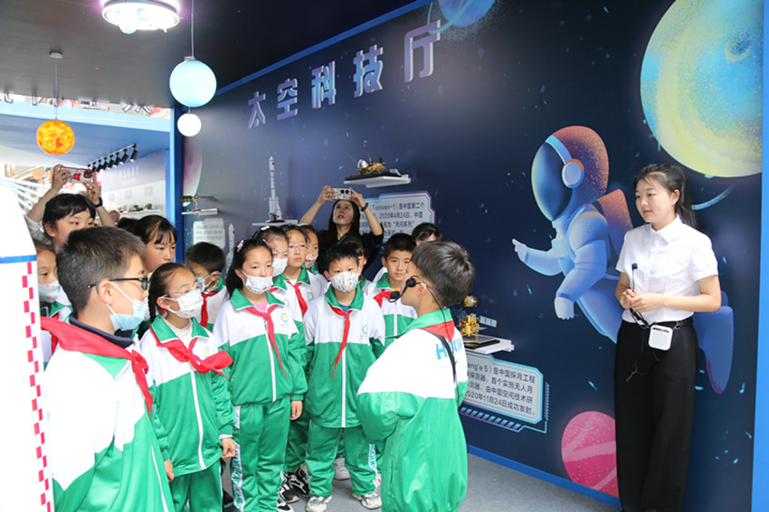 學(xué)生們在太空科技廳參觀。