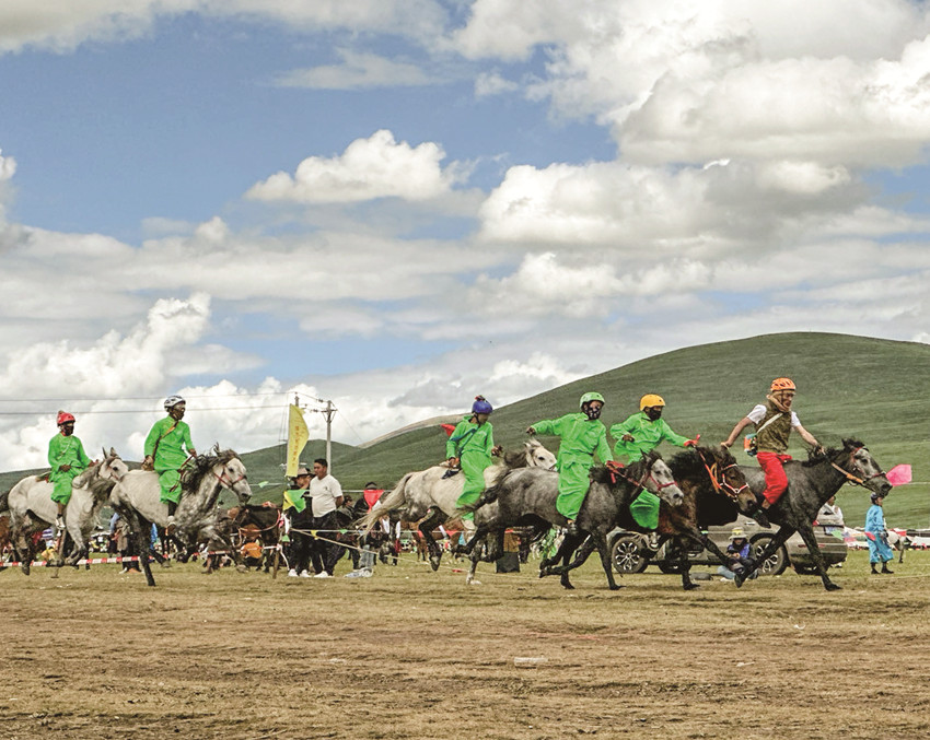 賽馬是藏族群眾娛樂(lè)生活的主要內(nèi)容,是極具特色的民俗活動(dòng),是藏族群眾對(duì)力量、勇敢、智慧的向往和崇拜,也是一項(xiàng)充滿激情的傳統(tǒng)民族體育運(yùn)動(dòng)。近年來(lái),色達(dá)縣利用“金馬節(jié)”這一傳統(tǒng)民族節(jié)日,開(kāi)展了長(zhǎng)跑、短跑和走馬等賽馬比賽,在遼闊的扎青塘草原中央,騎手們與賽馬緊密配合,英姿颯爽,風(fēng)采盡顯,卓越的表現(xiàn)引得場(chǎng)外加油聲、喝彩聲此起彼伏,群馬奔騰的景象震撼人心,讓前來(lái)觀賽的群眾大飽眼福,嘆為觀止。