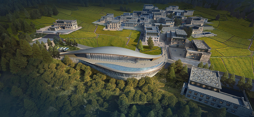 “這個香巴拉文化博物館模擬了‘吉祥八寶’之一的白海螺形態(tài),朝村莊一側(cè)是從地面延伸而成的體量,共分3層,總高度17.4米,總建筑面積2994.6平方米?!敝薪ò司治髂辖ㄔO(shè)工程有限公司項目總工喬興國向記者介紹,香巴拉文化博物館朝村莊一側(cè)是從地面延伸而成的體量,自然地融于山林中,朝山谷一側(cè)通過水面反射回應壯麗雪山。