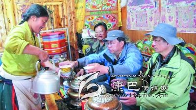 位于宗塔草原“大盆地”東邊山坡的降巴牧場在隊員們的心里也留下了深刻的印記。15日早上5點半隊員們就出發(fā)上了降巴牧場。朝霞映紅了天邊,紅云罩著青草牛糞味飄香的草坡。比采風隊員們起得更早的牧人已擠完了牛奶,一個僅10 歲的女孩正在草坡上拾牛糞;牛毛帳篷里,勤勞的牧婦已打開了牛奶分離器開始分離酥油了……一問,方知牧民們今晨4點就起床勞作,干完早上的活兒,他們要趕到三公里遠的“盆地”耍壩子,看賽馬。這個牧場靜謐潔凈得令人稱奇,青青的草坡上絕少有垃圾存留,沒見到一只兇惡的牧犬;按季節(jié)劃分的草場由整潔的網(wǎng)圍欄圈開,分隔有致;牧人舉家出門,連帳篷門也不掩,據(jù)說這里沒有偷盜發(fā)生,家人和諧;古老、平和的氣氛中,晨風輕拂,野花青草搖曳,輕柔的晨霧中偶而傳來兩聲牛哞,讓人頓感心靜如水。對于長期居住城市的人來說,這里無疑是“幽雅天堂”了。