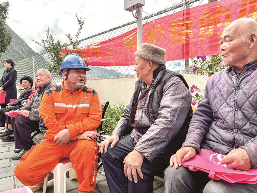10月11日,國家電網(wǎng)四川電力甘孜瀘定連心橋共產(chǎn)黨員服務(wù)隊(duì)隊(duì)員陪養(yǎng)老院老人話家常。