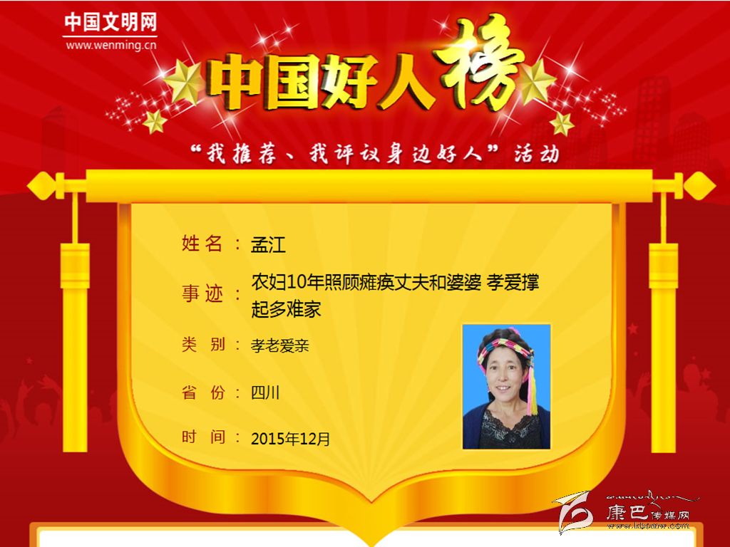 本網(wǎng)訊(丹巴縣委宣傳部)近日,從中央文明辦主辦、中國文明網(wǎng)承辦的“我推薦、我評議身邊好人”活動中傳來喜訊,最美媳婦孟江10年照顧癱瘓丈夫和公婆,孝愛撐起多難家入選“中國好人榜”。