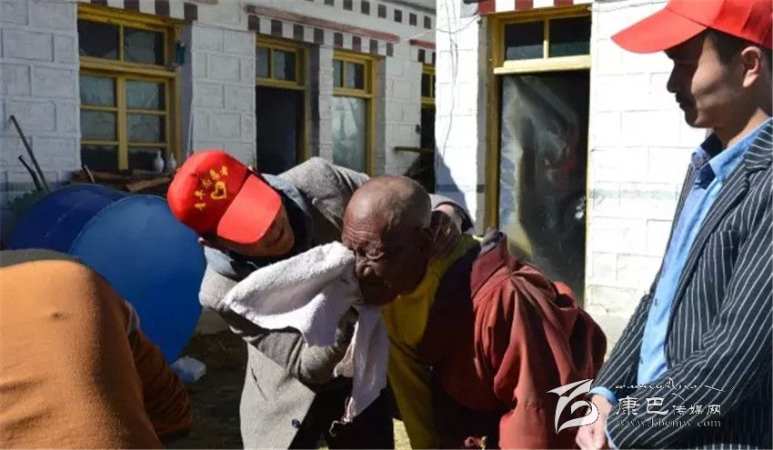 2015年11月10日理塘縣圣地青年志愿者服務(wù)隊成員勒布降措與向濤為曲登鄉(xiāng)敬老院孤寡老人理發(fā)。