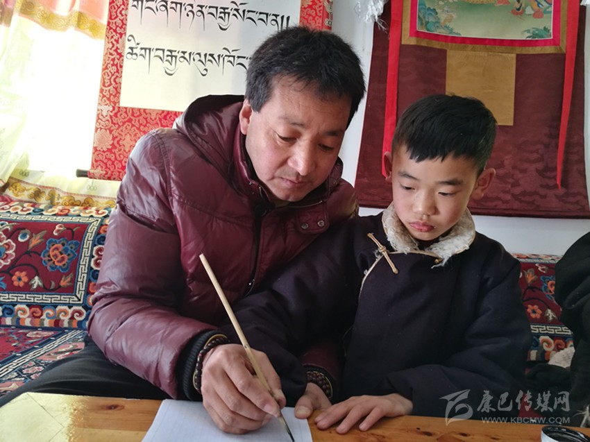 本網(wǎng)訊(余應(yīng)瓊 文/圖)“使用竹筆的時候拇指和食指握筆,要手腕用力,還要注意坐姿哦?!?/span>2月11日,元宵節(jié)這天,巴松鄧珠照例來到甘孜縣文化館,免費(fèi)為喜歡藏文書法的青少年授課,對小一點(diǎn)的孩子,還手把手地教起來。