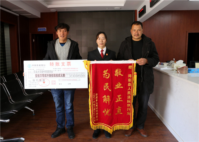 在執(zhí)行款發(fā)放現(xiàn)場(chǎng),得榮法院執(zhí)行局局長(zhǎng)小娜錯(cuò)法官正逐一核對(duì)當(dāng)事人信息,辦理領(lǐng)款手續(xù),她向筆者介紹說(shuō):“去年開始,我們?cè)诠矓M定出了29個(gè)基本解決執(zhí)行難的工作任務(wù),形成了7條具體措施,對(duì)所屬的11件執(zhí)行難案每件形成專項(xiàng)行動(dòng)方案,并將‘一案一辦法’的基本原則落實(shí)到了后續(xù)的23件案件執(zhí)行當(dāng)中,取得了良好的執(zhí)行效果,今后我們將持續(xù)深入執(zhí)行難專項(xiàng)行動(dòng),全面深入落實(shí)依法治理,切實(shí)保護(hù)人民群眾的合法權(quán)益,努力讓人民群眾在每一件司法案件中都感受到公平正義,感受到更多的幸福感和安全感?!?/p>