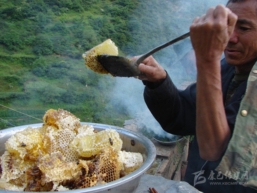 這時候,一位城里人開著車來到他家里,前來購買蜂蜜。蘭友才提著火爐,在里面撒上柏樹枝椏,打開蜂箱蓋子后,將煙霧吹進蜂箱里。不一會兒,蜜蜂們紛紛飛出巢穴,在幾十米開外不停的飛翔、徘徊,只留下滿箱雪白的蜂蠟一排排整齊的豎立在那里。蘭友才拿出一把刀,輕輕地在蜂蠟上割取,并迅速將浸滿琥珀色糖液的蜂蠟放進瓷盆里。蘭友才告訴我,蜂蠟的上半部分為蜂蜜,下半部分是蜂蛹的巢穴,因此只割取上半部分。