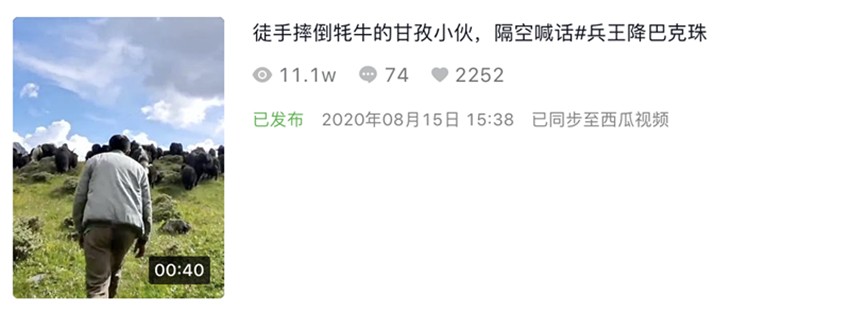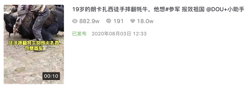 8月3日,這段僅有10秒長的視頻,在抖音短視頻平臺《甘孜日報》康巴傳媒抖音號發(fā)布后,短短一天內獲得了800多萬次播放量,200多名網(wǎng)友留言評論,18萬次點贊更是“宣告”其正式成為“網(wǎng)絡爆款”。