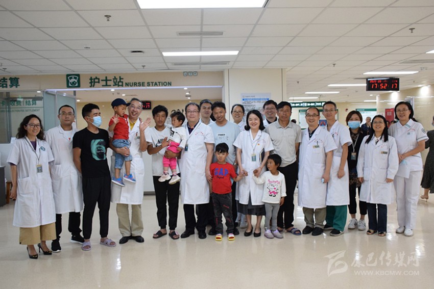 成都市第五人民醫(yī)院醫(yī)護(hù)人員與先心病小朋友、家屬合影。