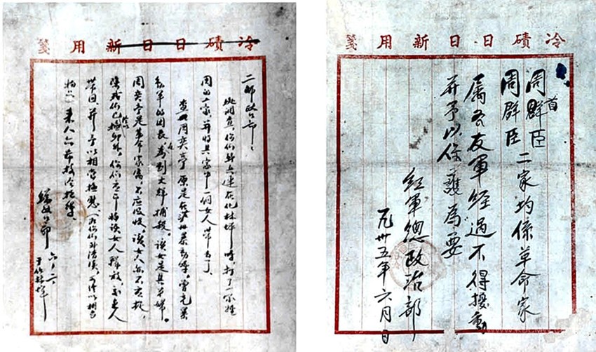 1935年6月2日,劉伯承同志寫給2師政治部的信。周奕庭是劉伯承順、瀘起義部隊的團長,起義失敗后轉入地下,1932年在成都被捕后遇害。紅2師先頭部隊抵達化林坪時錯將其家屬當作 “土豪”,抓走其弟媳。劉伯承同志為此給2師政治部寫信,說明其家為革命烈屬。其弟媳很快得到釋放,其家屬也得到了保護。