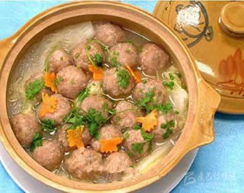 4、用微火把菜鍋中的酥油化成液體后加入生姜片、鹽、野生蒜、少量水、水?dāng)嚩狗郏谐沙霈F(xiàn)沸泡的時(shí)候,澆在魚(yú)肉丸子上蟲(chóng)草魚(yú)肉丸這道菜做成了。