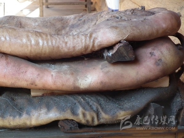 豬膘:在丹巴,豬膘是一種貯存豬肉的方式,是一種飲食習(xí)俗,同時,它又是財富的象征。在丹巴隨便走進一戶人家都可以看到少則幾扇、多則十余扇的豬膘掛在樓上,有些人家的豬膘甚至還貯存十多年之久。這些豬膘大多已經(jīng)被蟲吃掉了許多,但是他們也不會心痛,因為在過去,看一個丹巴人家庭是否富裕,就看他家有多少豬膘,豬膘越多就越富有。