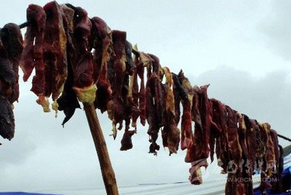 藏族同胞喜歡吃風干的牛羊肉。風干肉一般在冬天的十一月底制作。這時候的氣溫都比較低,在零度以下,把牛、羊肉割下來,掛在陰涼的地方,讓其風干,去出水份。藏民把牛、羊肉割成小塊串上,或用竹籠掛在帳房、屋檐下的陰涼處,第二年的三月之后,將早已風干的肉取來烤食或者直接生食,咀嚼時無渣塞牙。在高寒地區(qū),食品不易霉爛變質,去水又保鮮,故時至今日,吃風干牛肉之風仍盛行。