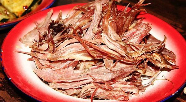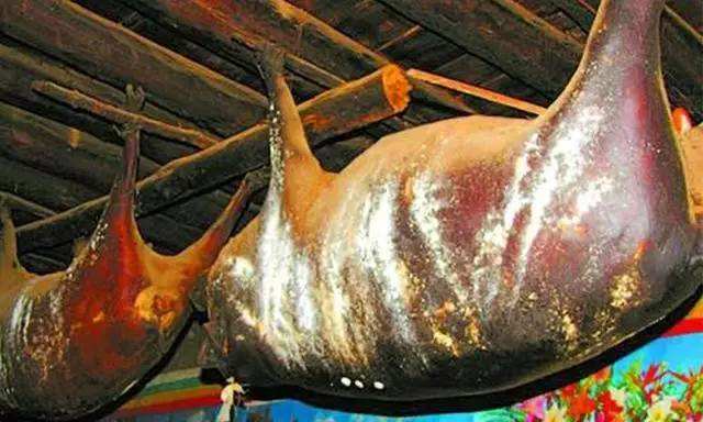 康南則用繩將豬勒死,讓血存于體內(nèi),然后用草點火去毛,于肛門處割一孔,取出內(nèi)臟,用干草或麥子等塞入豬腹內(nèi),用針縫合,縫口處用灶灰摻水?dāng)嚭铣珊芊?,掛在室?nèi),待其發(fā)酵,產(chǎn)生臭味時食用,稱“臭豬肉”。