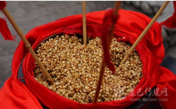 嘉絨語稱“恰鹵”。咂酒是青稞釀制而成的。首先取一定數(shù)量的青稞粒,一般5斤、8斤或10斤,在大鐵鍋中用水煮成八成熟后,放在簸箕里晾開,待冷卻后放上一定比例的酒曲,合勻,又裝入大鐵鍋中發(fā)酵三至四天,待聞到酒香味后,裝入壇中并加水,放置一天以上后,即可取汁食用,這個(gè)汁就是咂酒。咂酒味甘甜淳厚,十 分爽口,看似不醉人,但有的甘甜之中略帶苦澀,說明酒勁足,不勝酒力者應(yīng)少飲為宜。曾有人寫《飲咂酒詩》說:“成石雜糧一甕收,王侯到此也低頭,五龍抱住 撐天柱,咂盡黃河水倒流”。充分展示了咂酒的魅力和飲咂酒的那種愜意。境內(nèi)巴底、半扇門的上半鄉(xiāng)、太平橋鄉(xiāng)一帶的群眾喜愛煮咂酒,平日,家家都備有咂酒,親朋間禮尚往來、人情世故都送咂酒。喝咂酒是當(dāng)?shù)氐囊淮罅?xí)俗?!墩鹿韧椭?略)》記載了清朝后期宅壟土屯區(qū)的飲食習(xí)俗時(shí)說:“夷人(封建統(tǒng)治者對藏族的貶 稱)寨中置巨甕或木桶,富者大銅瓶盛酒,于內(nèi)植竹竿十余枝,跌坐于地互相吸飲,不杯杓勸酧(酬),無餚核(指熟食的魚肉干果),惟各布豬膘、牛肉、‘得木 鳥’(火燒子饃饃),醉飽而散”。現(xiàn)在,巴底鄉(xiāng)、半扇門的上半鄉(xiāng)、太平橋鄉(xiāng)的大多數(shù)村寨仍然保留著這些習(xí)俗。在節(jié)日或慶典之時(shí),在大壩子中間放一個(gè)大的壇子或木桶,里面盛滿含有酒糟的咂酒,然后插入麥桿數(shù)根,眾人圍個(gè)大圓圈跳鍋莊,口渴時(shí)依次吸之;或一人手持葫蘆,里盛咂酒,在眾人中依次轉(zhuǎn)之;或眾人盤腿 圍坐,傳一壺咂酒,稱喝“轉(zhuǎn)轉(zhuǎn)酒”。