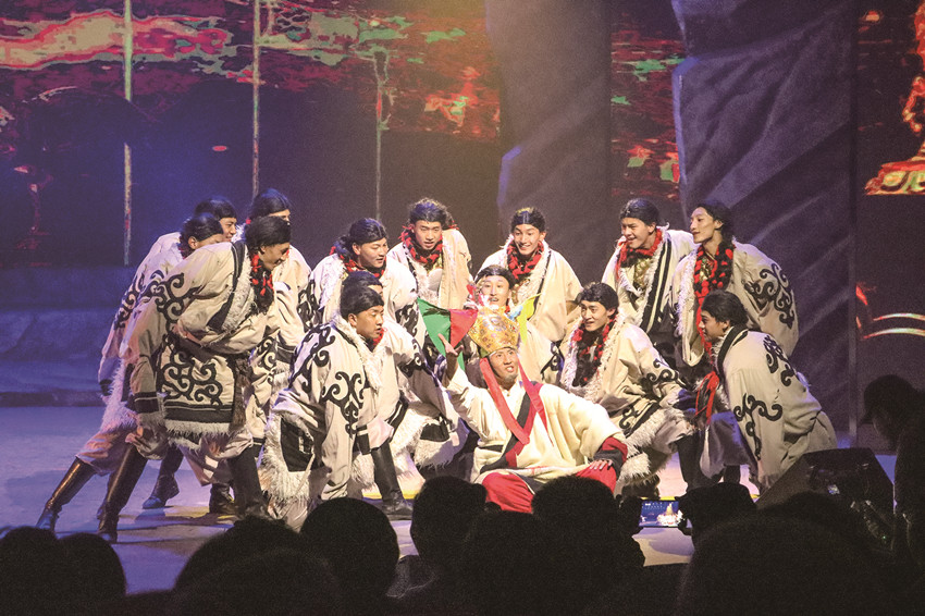 這是一場充滿康巴文化底蘊的視聽盛宴,高品質(zhì)的演出陣容,極具地方特色的舞臺效果,引人入勝的劇情細(xì)節(jié)……演出在一首阿卡貝拉版《康定情歌》中拉開序幕,7名演員以多聲部合聲演繹這首蜚聲中外的世紀(jì)情歌,舞臺紗幕上顯現(xiàn)的星光點點,仿佛將璀璨星空搬到了舞臺上。
