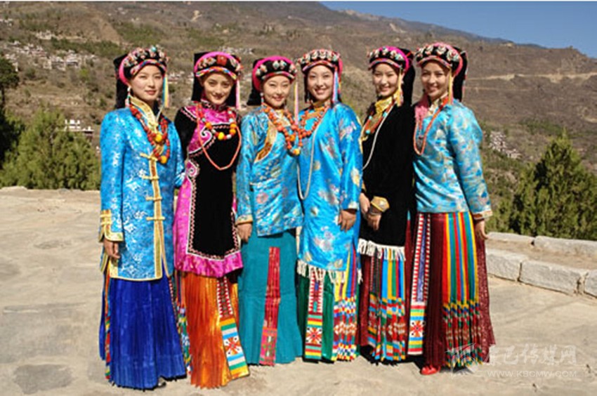 以丹巴縣和康定縣大渡河沿岸為代表。康定魚通區(qū)和雅拉鄉(xiāng)一帶又自有特點(diǎn)。以長方形黑金絲絨底繡花頭帕對折,戴于頭上,額前伸出約數(shù)厘米,腦后下披至后頸,寬至兩鬢,然后用大紅頭繩或五彩頭繩瓣發(fā)盤于帕上,辮子套各式辮飾。外披披風(fēng),一般是條紋白色或原初皮毛披風(fēng),內(nèi)穿錦緞上衣,下著五彩百褶長裙,腰系絲織或綢質(zhì)彩色花腰帶,男戴金絲帽,足穿彩靴為風(fēng)彩。嘉絨地區(qū)服飾還受羌族習(xí)俗的影響,生活俗裝普遍穿長等衫,以藍(lán)黑色為主,下身系圍腰,腰扎寬大彩帶,冬天穿羊皮褂或羊毛織成的無領(lǐng)服等。