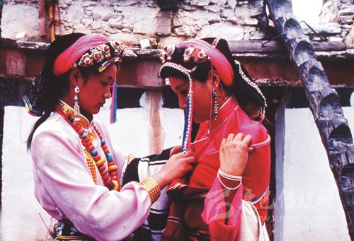 康區(qū)婦女戴頭帕很有特色,嘉絨婦女繡花頭帕,以長方形帕對折,戴于頭上,額前伸出約3公分,腦后下垂至后枕,寬至兩鬢,然后用大紅頭繩或五彩頭繩辮發(fā)盤于帕上,辮子套各式辮飾。康南婦女戴頭帕時,額前折褐成帽狀,腦后成巾狀下垂至肩。木雅婦女戴袋狀帽,將帽沿一側(cè)內(nèi)疊扣于買上,上沿額伸出頭額前約3公分,寬至兩鬢,長約30公分的袋狀帽箭垂于腦后,然后用大紅頭繩或五彩頭繩編發(fā)辮纏盤于帽上。魚通人則用長丈余之青綾布纏裹頭部,形成碩大的盤頭。