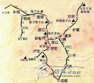 成都—雅安—瀘定橋 (瀘定)—木格措、跑馬山、康定情歌城(康定)—八美土石林、慧遠(yuǎn)寺(八美)—靈雀寺、道孚民居、龍燈大草原(道孚)—壽寧寺、爐霍石棺墓葬群 (爐霍)—郎吉曲登佛塔、佛學(xué)院(色達(dá))—甘孜寺、甘孜雅礱灣、扎日擁康(甘孜)—成都